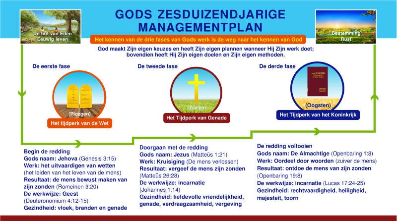Zoals altijd het geval is geweest, begon God Zijn nieuwe werk van de tweede fase na het werk van Jehova in het Tijdperk van de Wet: het vlees aannemen – als vleesgeworden mens tien, twintig jaar – en Zijn werk verkondigen en doen onder gelovigen. Toch wist niemand en erkende maar een klein groepje mensen dat Hij de vleesgeworden God was nadat de Heer Jezus aan het kruis genageld en herrezen was. … Zodra de tweede fase van Gods werk was voltooid — na de kruisiging — was Gods werk volbracht om de mens van zonde terug te winnen (dat wil zeggen: de mens uit de handen van Satan terug te winnen). Vanaf dat moment hoefde de mens alleen maar de Heer Jezus als de Heiland aan te nemen voor de vergeving van zijn zonden. De zonden van de mens waren zogezegd geen belemmering meer om het heil te verkrijgen en tot God te komen. Satan kon ze ook niet meer ter beschuldiging tegen de mens inbrengen. God had namelijk Zelf het echte werk gedaan. Hij was in de gedaante van het zondige vlees gekomen en God was Zelf het zondoffer. Op die manier kwam de mens van het kruis af, verlost en gered dankzij het vlees van God, de gelijkenis van dit zondige vlees. De mens kwam zo na de gevangenschap door Satan een stap dichter bij het aanvaarden van de verlossing voor Gods aangezicht. Deze fase van het werk was uiteraard het management van God, één stap verder dan het Tijdperk van de Wet en van een dieper niveau dan het Tijdperk van de Wet.